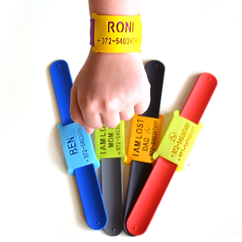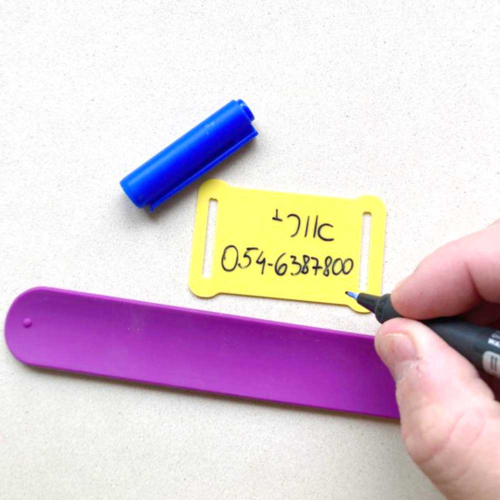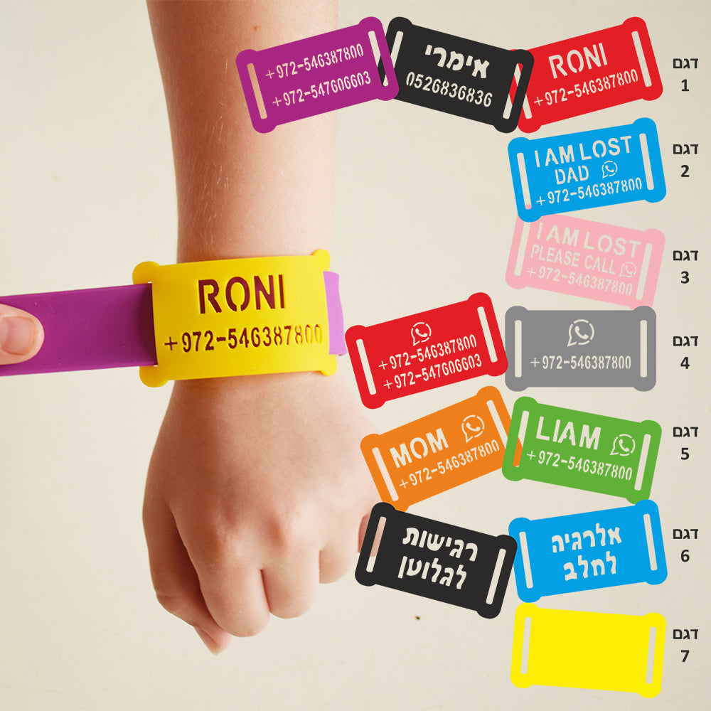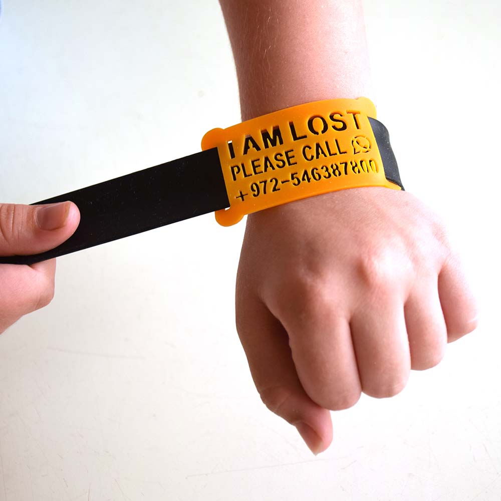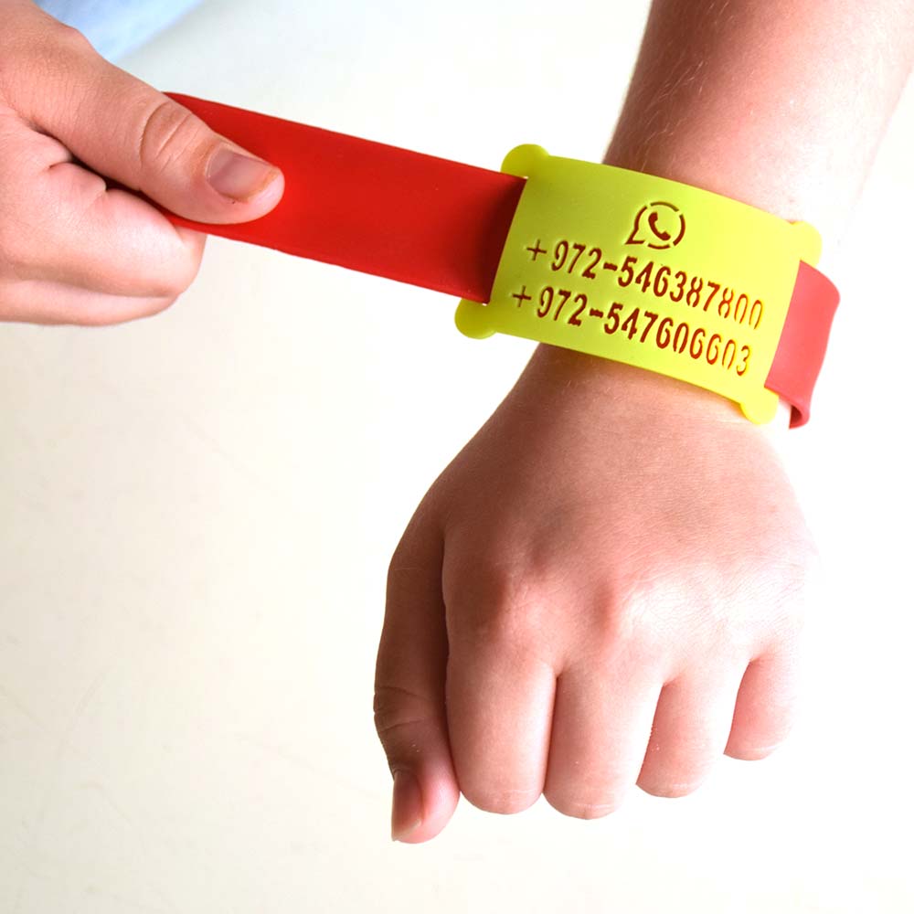 צמיד "סרגל" עטוף בחומר סיליקון בתוספת תווית עם פרטי קשר ושם .
