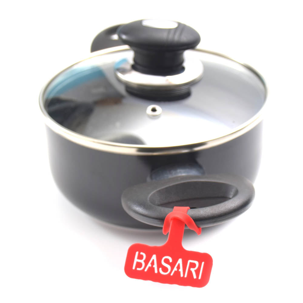 סט של 4 תוויות זהות (בצבע אדום) לסימון סירים עם הכיתוב BASARI, מתאימות לשימוש במטבח או באירוע.