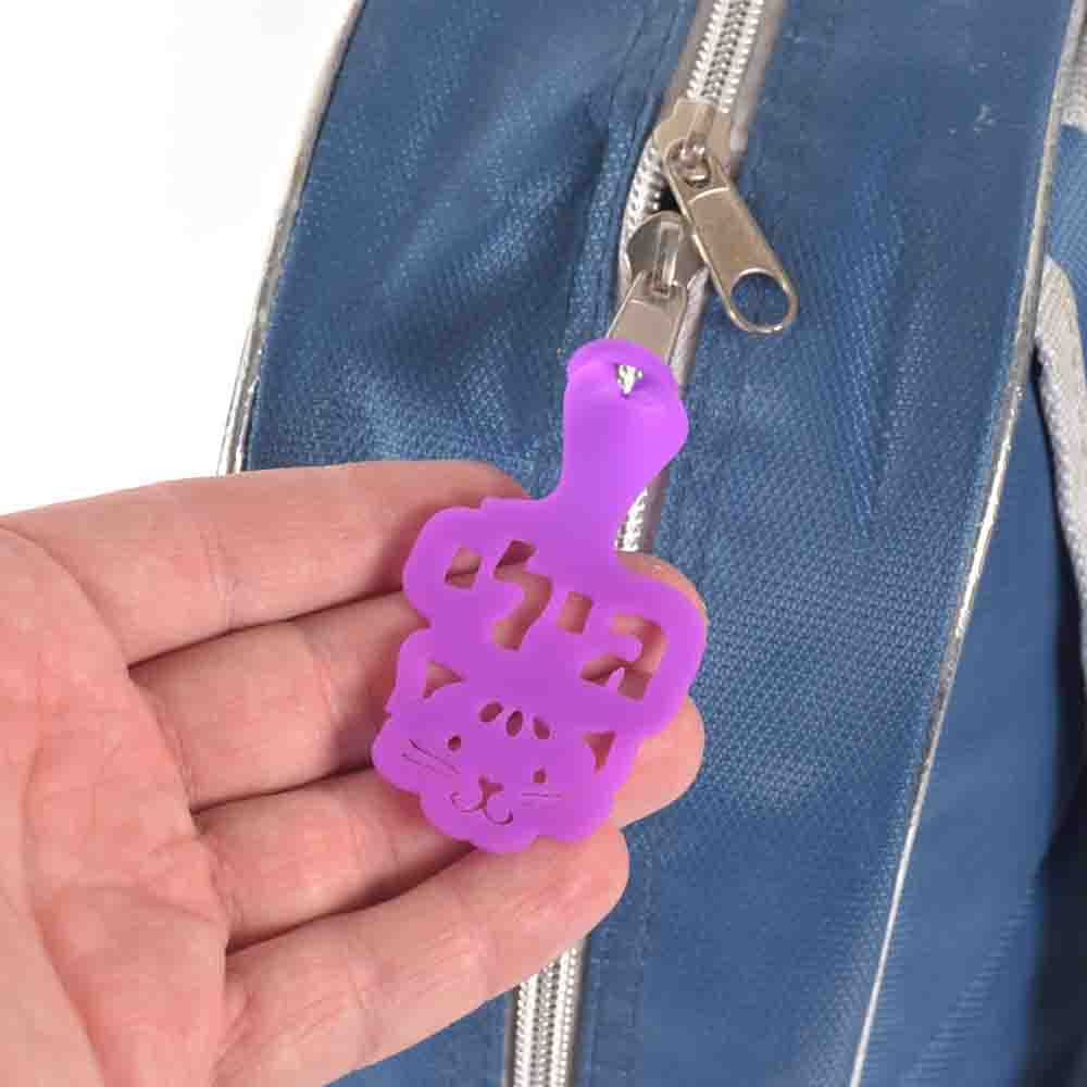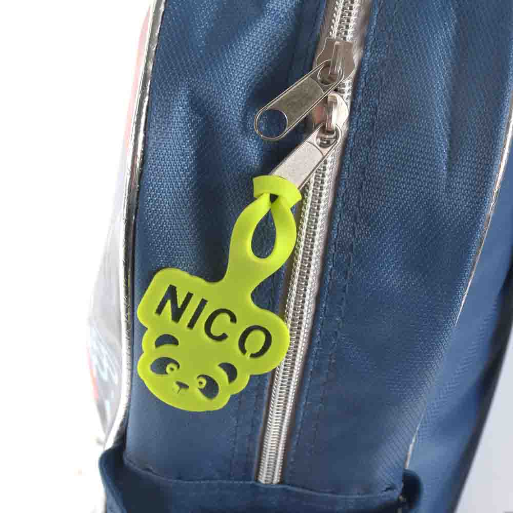 התגית שם "מתלפפת" על הרוכסן (או לולאה) של התיק ונשארת בולטת לעין.